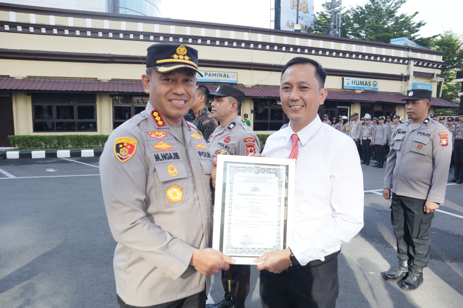 Makassar – Kapolrestabes Makassar, Kombes Pol Dr. Mokhamad Ngajib, SIK, MH, memberikan penghargaan kepada 43 personil Polrestabes Makassar dan jajaran Polsek yang berprestasi dalam upacara apel pagi yang berlangsung di halaman Polrestabes Makassar pada Selasa (16/07/2024).