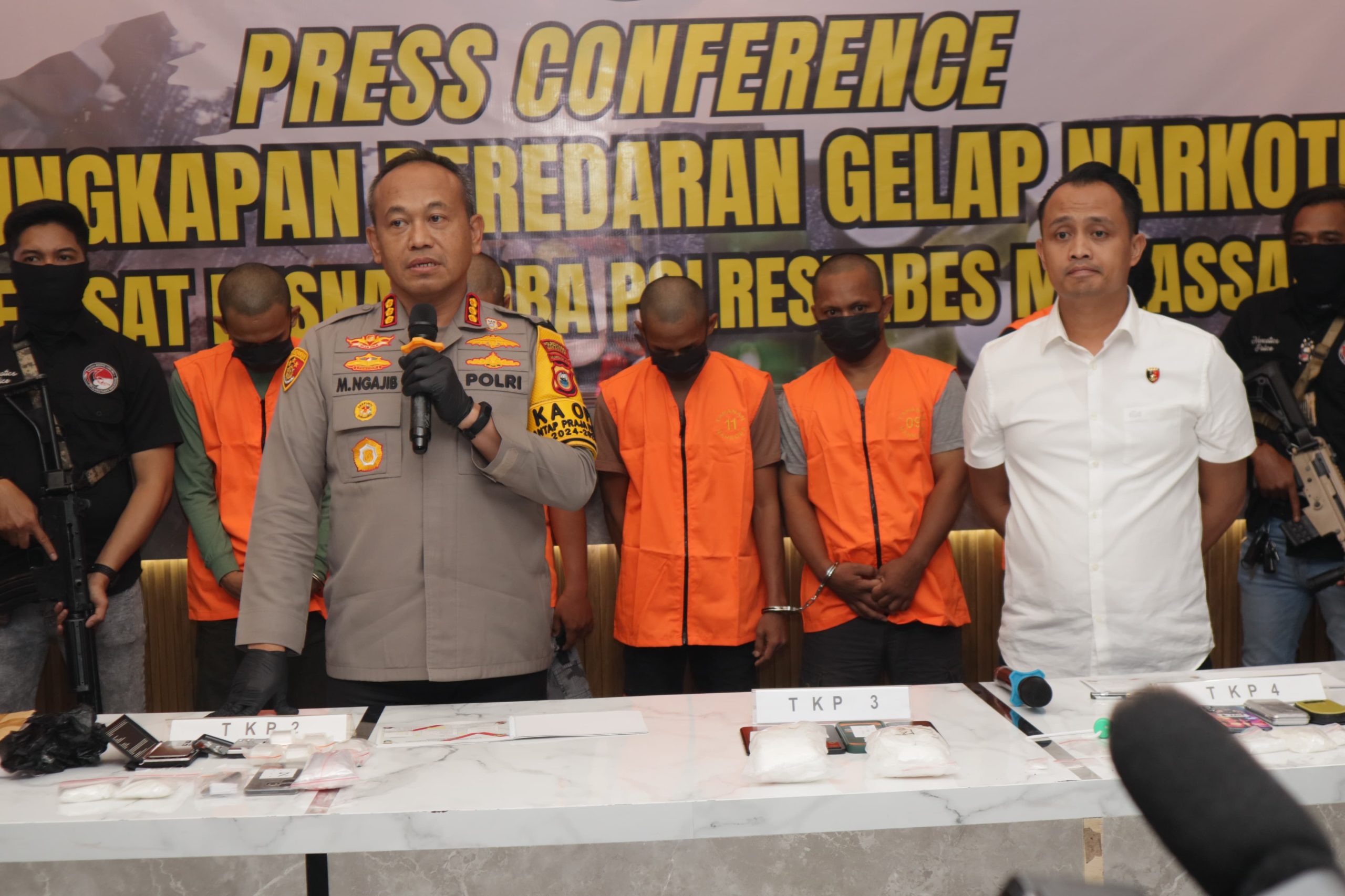 Kapolrestabes Makassar Kombes Pol Dr. Mokhammad Ngajib, S.I.K., M.H didampingi Kasar Narkoba Polrestabes Makassar Kompol Lulik Febyantara, S.I.K., M.H dalam konferensi pers di Aula Mappaodang Polrestabes Makassar, Selasa (10/09/2024) mengungkapkan 5 tersangka peredaran narkoba berhasil diamankan.