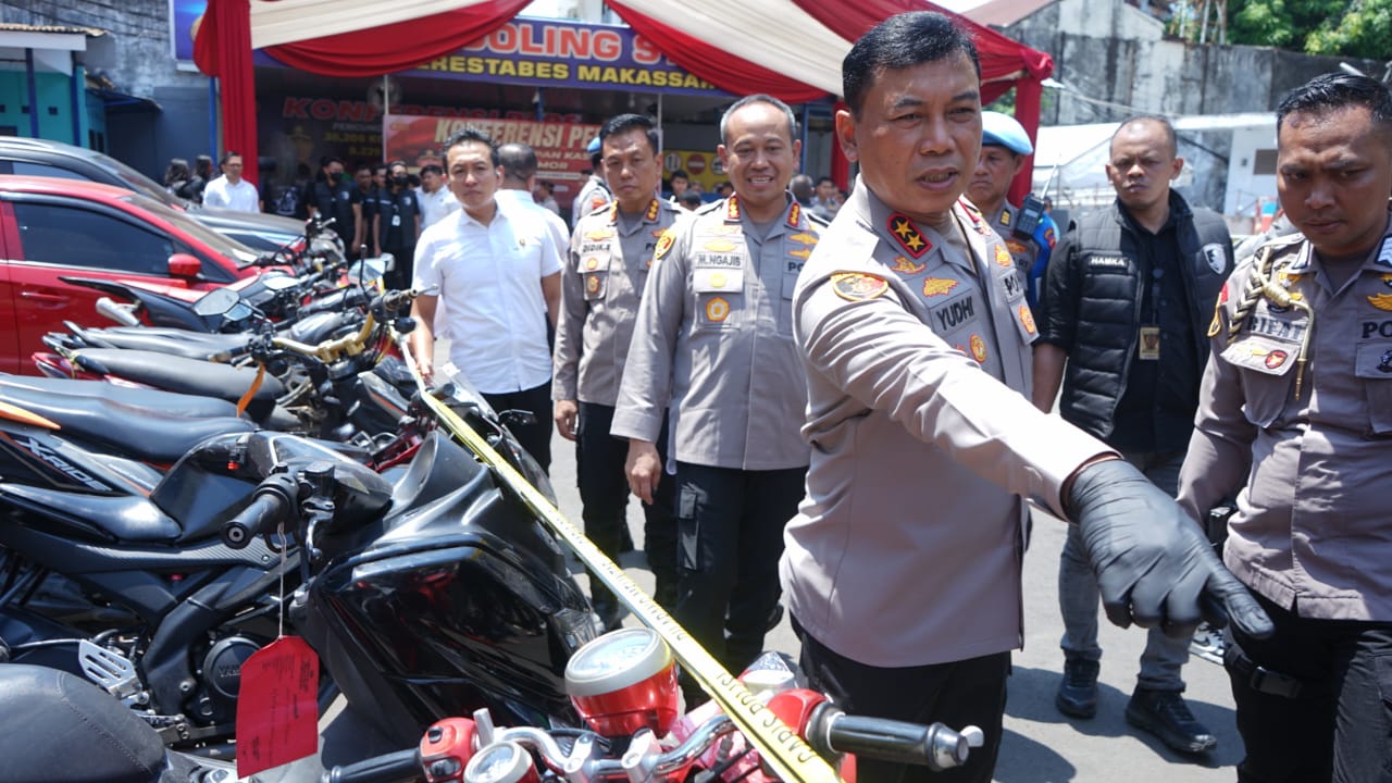 Kapolda Sulsel Irjen Pol Yudhiawan bersama Kapolrestabes Makassar Kombes Pol Mokhamad Ngajib memperlihatkan Barang Bukti Curanmor yang diamanakan Polrestabes Makassar saat konferensi pers, Senin (28/10/2024).