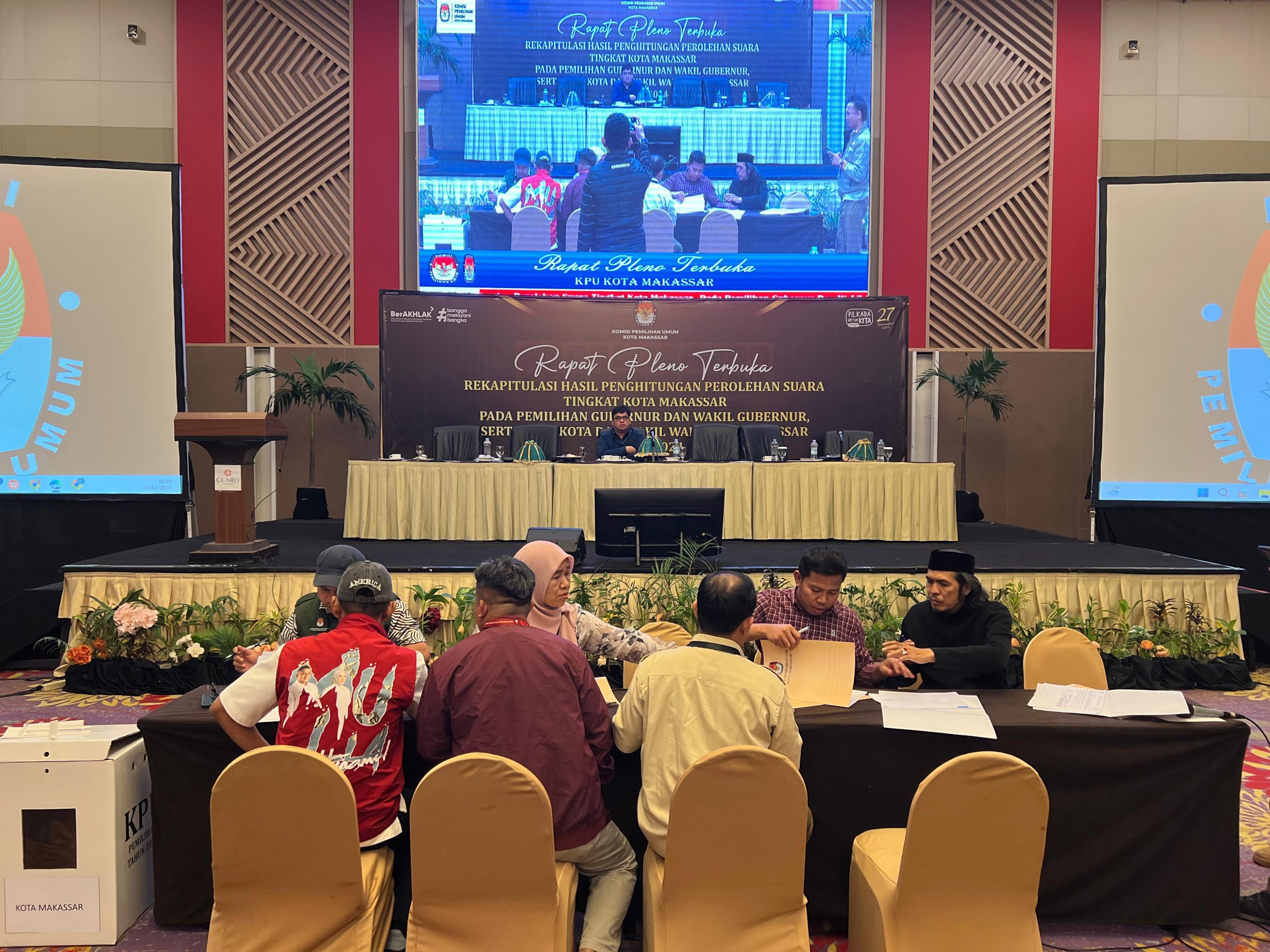 Baris.id, Makassar – KPU Kota Makassar rapat pleno terbuka rekapitulasi hasil perhitungan perolehan suara tingkat Kota Makassar pada Pemilihan Gubernur dan Wakil Gubernur Sulawesi Selatan serta Wali Kota dan Wakil Wali Kota Makassar Tahun 2024. bertempat di Sandeq Ballroom, Hotel Claro Makassar, Jumat malam (6/12/2024).