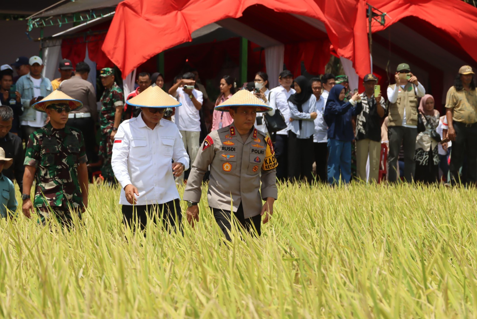 Bone – Kepala Kepolisian Daerah Sulawesi Selatan, Irjen Pol. Drs. Rusdi Hartono, M.Si., mendampingi Gubernur Sulawesi Selatan, Andi Sudirman Sulaiman, dalam kegiatan Panen Raya Padi Serentak yang dilaksanakan di Desa Samaelo, Kecamatan Barebbo, Kabupaten Bone. Kegiatan ini merupakan bagian dari kunjungan kerja Pemerintah Provinsi Sulawesi Selatan dalam rangka mendukung ketahanan pangan daerah, pada Senin (7/4/2025).