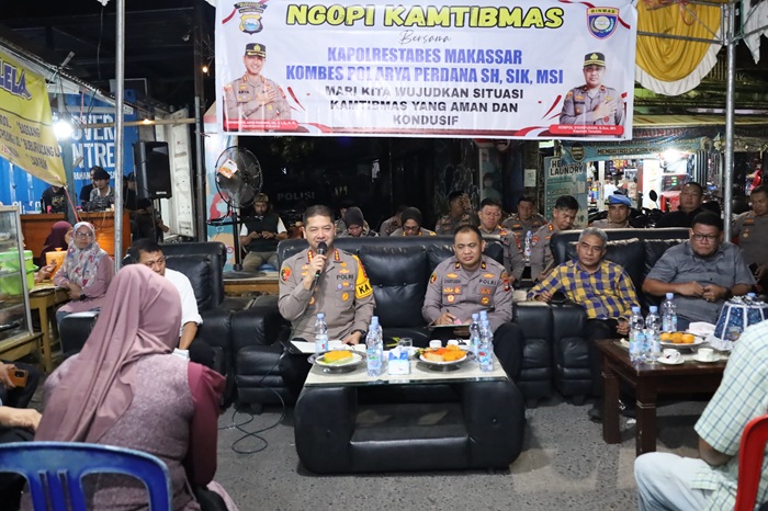 MAKASSAR — Kapolrestabes Makassar, Kombes Pol Arya Perdana, S.H., S.I.K., M.Si., menghadiri kegiatan Ngopi Kamtibmas bersama masyarakat di Kantor Kelurahan Mangasa, Kecamatan Tamalate, pada Jumat malam (25/7/2025). Acara yang berlangsung mulai pukul 20.45 hingga 22.40 WITA ini bertujuan mempererat sinergi antara kepolisian dan warga dalam menjaga keamanan serta ketertiban masyarakat (kamtibmas).
