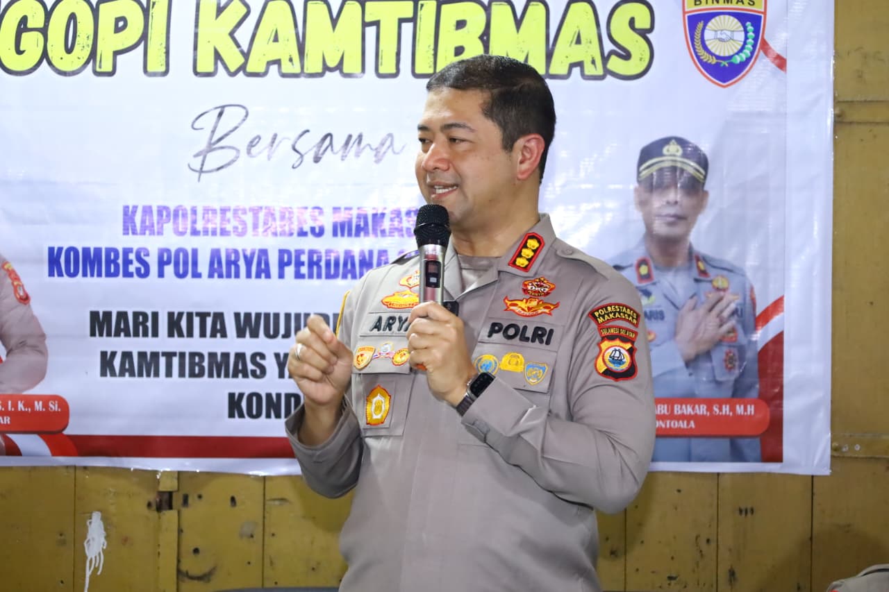Makassar — Kapolrestabes Makassar, Kombes Pol. Arya Perdana, S.H., S.I.K., M.Si., melaksanakan kegiatan Ngopi Kamtibmas bersama warga Kelurahan Layang, Kecamatan Bontoala, Kota Makassar, pada Jumat malam (1/8/2025) sekitar pukul 20.30 WITA. Kegiatan berlangsung di Jl. Tinumbu Lr. 149 No. 21 dan dihadiri unsur Tripika, pejabat utama Polrestabes Makassar, tokoh masyarakat, serta ratusan warga dari berbagai elemen.