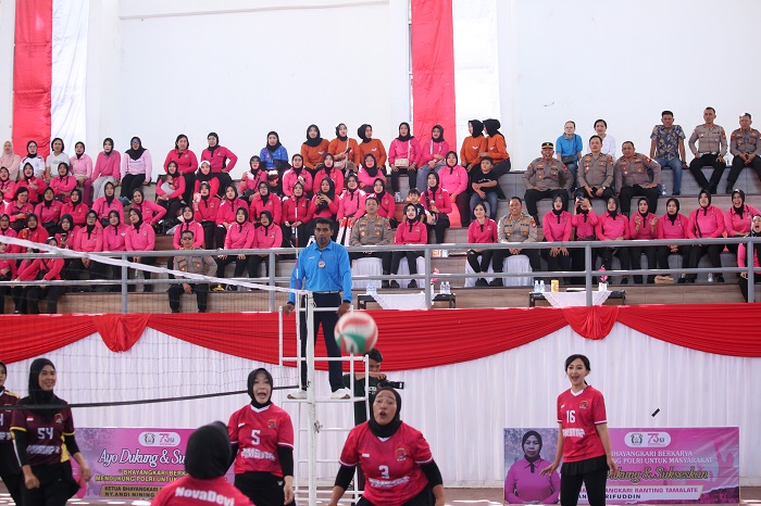 Makassar – Babak final turnamen bola voli dalam rangka memperingati Hari Kesatuan Gerak Bhayangkari (HKGB) ke-73 yang dirangkaikan dengan HUT RI ke-80 berlangsung meriah di GOR Universitas Hasanuddin, Tamalanrea, Makassar, Selasa (19/8/2025).