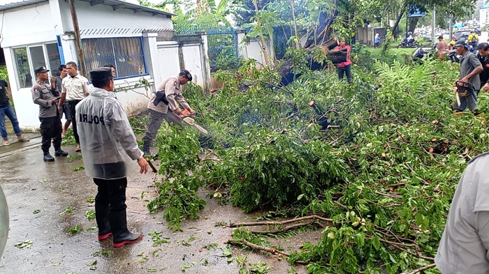 Personel gabungan dari Polsek Biringkanaya dan Polda Sulawesi Selatan, dibantu warga sekitar, bergerak cepat melakukan evakuasi batang pohon yang menutupi jalan dan sempat menimpa pengendara yang melintas.