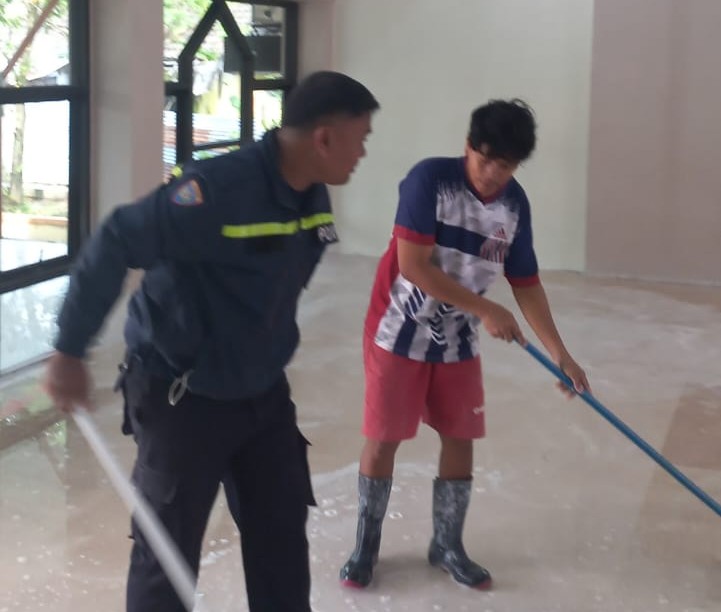 Kerja bakti tersebut berlangsung penuh kebersamaan. Warga bersama aparat bahu-membahu menyapu, mengepel, serta membersihkan sisa lumpur yang menempel di lantai dan perlengkapan masjid.
